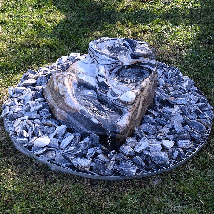 Wunderschöner, per Hand geschliffener Black Angel Naturstein mit eingearbeiteten Terrassen als besonderes Merkmal. Das Wasser quillt in der obersten Terrasse hervor und fließt über jede Terrasse nach unten. Ein besonderes Wasserspiel, das als Zierbrunnen und auch aus Vogeltränke verwendet werden kann. Der massive Naturstein wird in 2 Größen als Komplettset angeboten und ist 100% frostsicher. Im Lieferumfang enthalten sind: Einbautank, Außenpumpe, Quellstein, Black Angel Zierkies, Wasserschlauch. Optional ist eine Quellbeleuchtung in diversen Farben lieferbar.