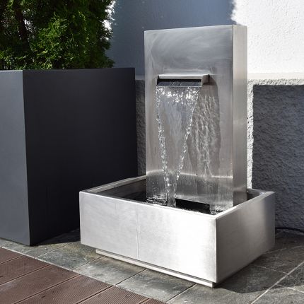 Die kompakten Abmessungen ermöglichen die Aufstellung des Edelstahlbrunnens bodeneben, teilversenkt oder auch freistehend auf Balkonen, Terrassen oder Dachterrassen. Der Wasserauslauf aus Edelstahl erzeugt ein schönes, breites Wasserbild mit angenehmer, beruhigender Akkustik. Eine innen liegende LED Beleuchtung zaubert sehenswerte, warmweiße Licheffekte hervor und an heißen Tagen können Sie Ihre Füße im großen Edelstahlbecken abkühlen. Hergestellt in Deutschland aus hochwertigem Cortenstahl & Edelstahl, die absolut frostsicher und winterfest sind.