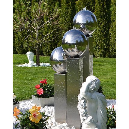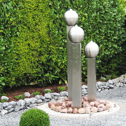 Edelstahl Gartenbrunnen Frankfurt 3er SET 130S30Gartenbrunnen mit 3x V4A Edelstahlsäulen und 3x Edelstahlkugeln Ø 30cm Gesamthöhe von 90/110 und 130cm