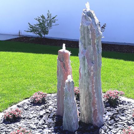 Quellstein Sets Polaris Marmor - Dieser einzigartige Naturstein fällt durch seine prächtige Farbgebung auf - rosa, weiß, grau, anthrazit und selten auch grün, machen jeden Quellstein zu einem wertvollen Unikat.. Die Eigenschaften hohe Abriebfestigkeit, Tausalzbeständigkeit und Frostsicherheit qualifizieren ihn zu einem winterfesten Gartenbrunnen. Damit eignet sich der Polaris Marmor für nahezu jedes Gartenprojekt - und macht das Endprodukt zum Meisterwerk. Polaris Marmore sind einer der wenigen Buntmarmore Europas. Verschiedene Formen und Größen zwischen 40 und 600cm Höhe werden weitgehend in Handarbeit hergestellt. Lagerware - Original Bilder verfügbar