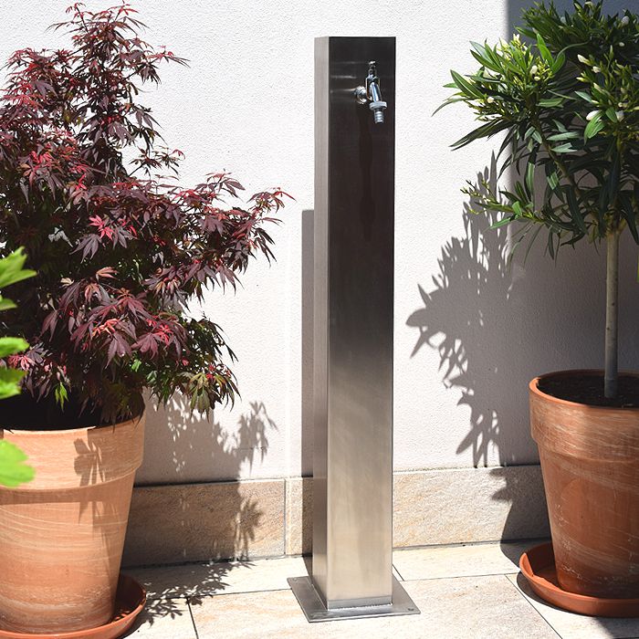 Die aus V4A Edelstahl hergestellten Wasserentnahmestellen bestehen aus einer Rundsäule mit einem Durchmesser von 10cm und einer Höhe von 100cm. Die Oberflächen der Säule ist matt gebürstet. Über eine Flanschplatte kann die Säule auf jedem Untergrund befestigt werden. Im Zubehör inkludiert ist ein Wasserhahn und ein Gardena Anschluss 1/2 Zoll (Zuleitung)