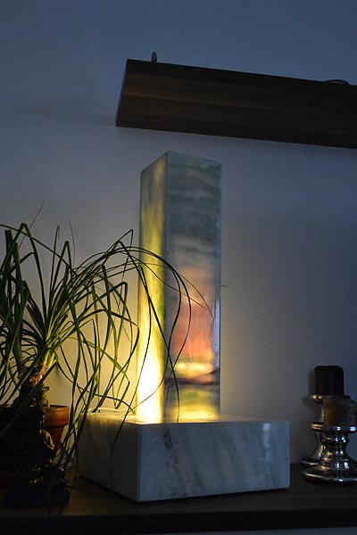 hinterlässt uns wertvolle Schätze, die in den Tiefen der Erde gefunden und schonend für die Natur abgebaut werden. Durch ein besonderes Herstellungsverfahren werden Steinplatten mit einer Stärke von 1 und 2cm gesägt und so wird es möglich, einige Marmorsorten von innen her zu beleuchten. Dabei wird jede Maserung, jeder Gesteinseinschluss sichtbar und liefert immer wieder neue, faszinierende Lichteffekte. Funkelnde Lichtstrahlen - Sanfter Klang des Wassers - Reinigung & Energie für den Raum. Dieses Design verbindet - Skulptur - Wasserobjekt - Lichtobjekt - Alles in einem Wohnaccessoires