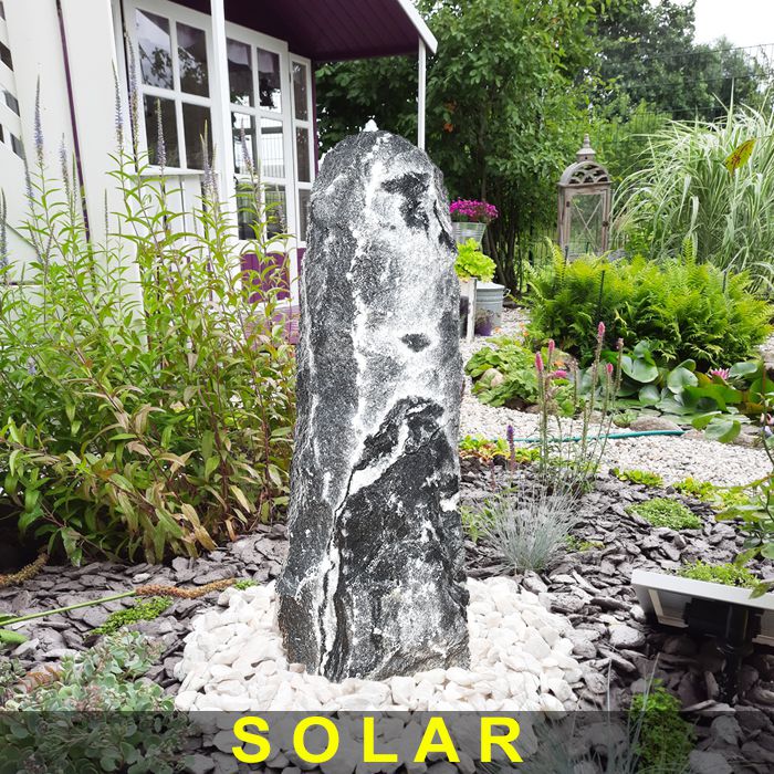 Die Oberfläche des Natursteines ist mit glitzernden, kristallinen Quarzteilchen überseht, so dass Sonnenstrahlen und Wasser zusammen einen sehenswerten Effekt hervor bringen. Die Farbkontraste, die immer wieder anders ausfallen, machen jeden Quellstein aus Tiger Marmor zu einem unverwechselbaren Unikat. Die Farben Grau und Anthrazit dominieren und der Stein lässt sich wunderbar vor allem in japanisch Gartenanlagen integrieren. Funktioniert ganz ohne Strom mittels Solarpumpe. Das Kabel von Pumpe zu Solarmodul ist 5 Meter lang. Ebenso das Kabel zur Quellbeleuchtung. Praktisch ist auch die Fernbedienung, die für noch mehr Komfort sorgt. Einfach installiert lassen sich mit Solaraustattung auch Quellsteinbrunnen ganz ohne Strom schön in Szene setzen.