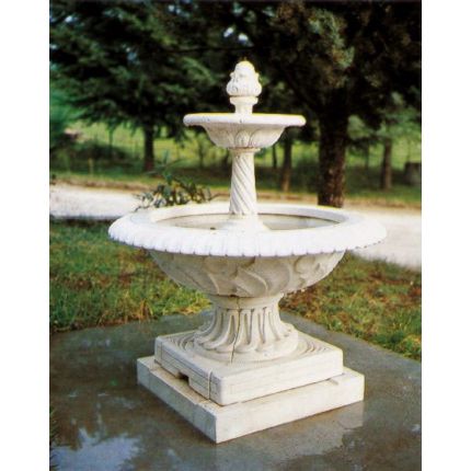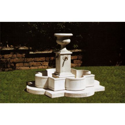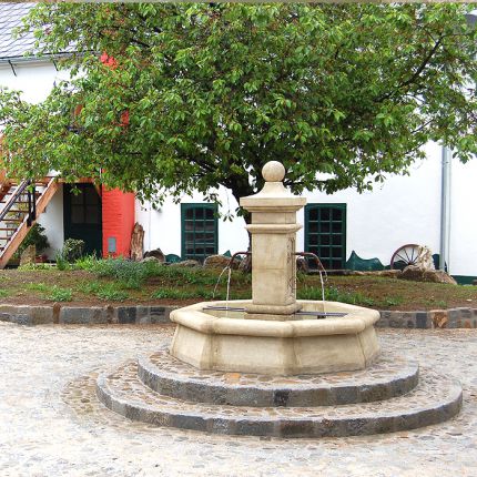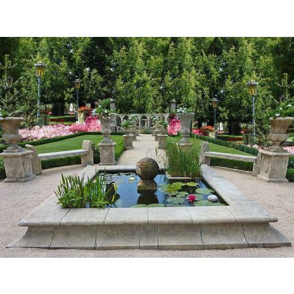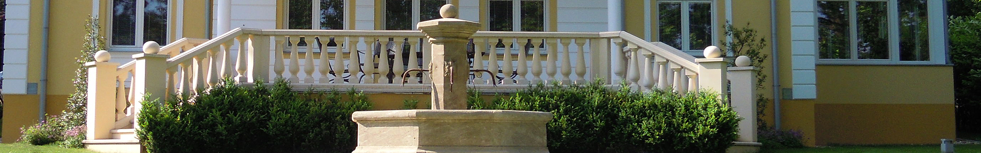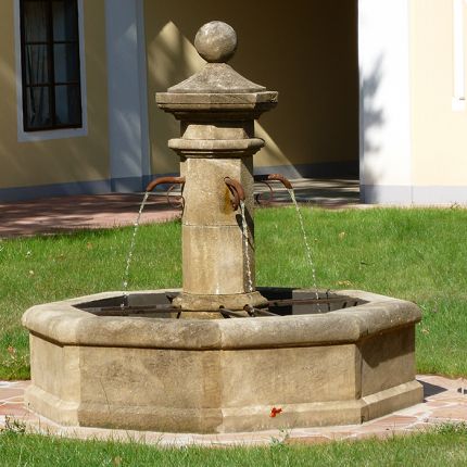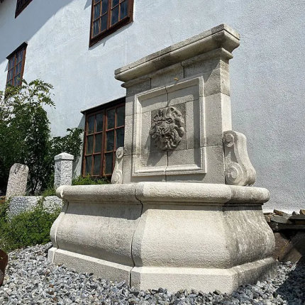 Gebrochene Kanten, veraltet wirkende Patina - alles Hinweise mit welcher Liebe zum Detail bei der Herstellung gearbeitet wird. Vorbilder der hier angebotenen Natursteinbrunnen stammen aus der Epoche des Barocks, der europäischen Kunstgeschichte, die von etwa 1575 bis 1770 währte. Mitunter ist ein charakteristisches Kennzeichen des Barocks die Tendenz, Grenzen zwischen den einzelnen Kunstgattungen, Architektur, Skulptur und Malerei, zu verwischen. Weitere Aspekte waren ein Streben nach Reichtum und Bewegtheit im Ausdruck. Neben den schweren massiven Steinelementen bildet die präzise Handarbeit, die über Generationen von Vater zu Sohn weiter gegeben wird den Ausgangspunkt für diese Monumente. Drei verschiedene Sorten halbweicher Kalksteine aus der Provence werden für diese Gartenbrunnen Modelle eingesetzt. Dieser extrem widerstandsfähige und geschichtsträchtige Naturstein ist feinkörnig und sehr gut zu verarbeiten. Der unter freiem Himmel erfolgende Abbau des feinkörnigen und dichten Kalksteins geht auf die Zeit der Römer zurück. Berühmte Bauwerke sind: Champs Elysées Gallerie in Paris, Trevor House in London, Stanford Universität in USA, St. Charles Hospital, Montpellier und das Empire Theater in Liverpool.