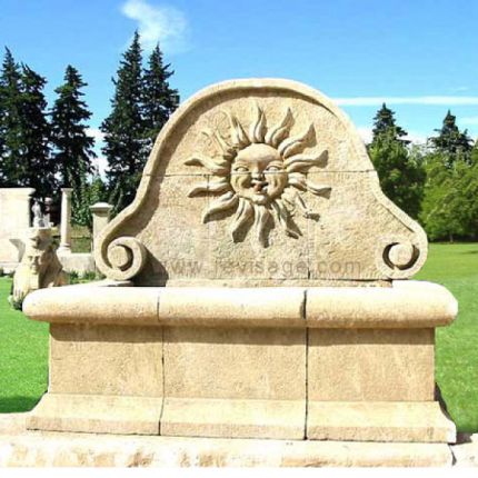 Naturstein Wandbrunnen SoleiMassiver Natursteinbrunnen mit großem Sonnensymbol. Antikbrunnen in Handarbeit gefertigt.