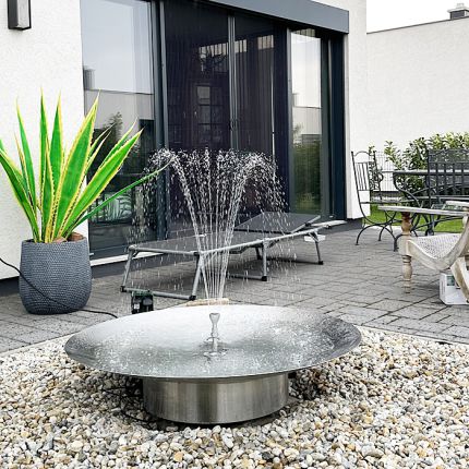 Edelstahlbrunnen Wasserschale Cascara 120 M1Hochwertige Edelstahl-Wasserschale Ø 120cm und LED Beleuchtung - Wasser nicht überlaufend